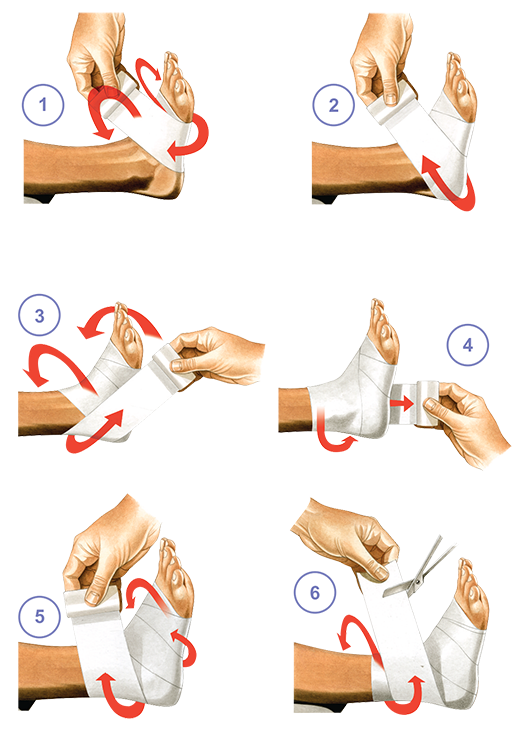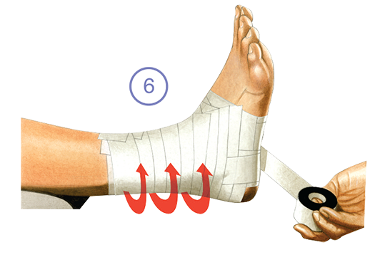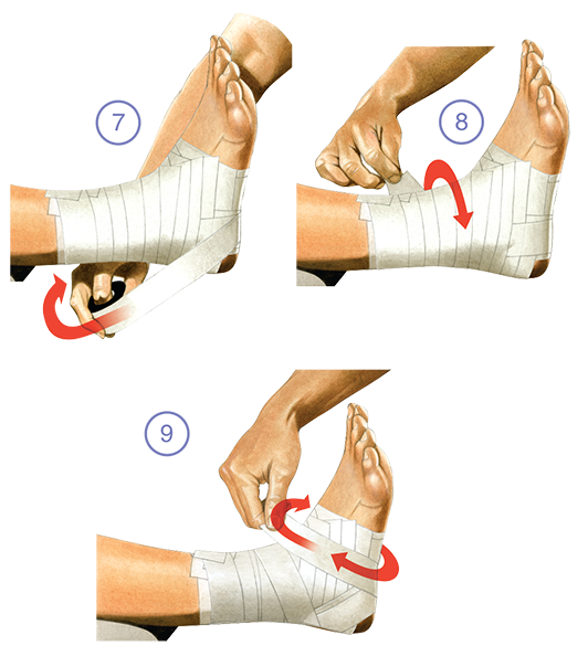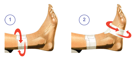 En los casos de esguince de ligamentos del tobillo, la técnica de vendaje funcional se inicia aplicando la venda sobre la planta del pie a la altura de los dedos, rodeando el empeine y el pie hacia el lado interno y hacia arriba en forma de ocho, con soporte del talón y luego hacia el lado externo. El sentido debe ser de externo a interno. Al llegar a cubrir unos centímetros del extremo inferior de la pierna, cortar la venda y fijar con tela adhesiva.