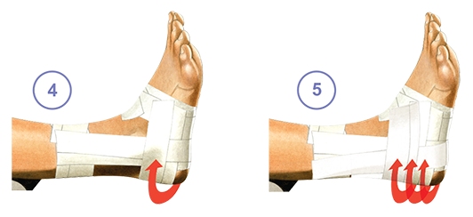 Para los casos de esguinces por inversión (3), aplicar una tira a modo de estribo desde la cara interna de la pierna que pase por debajo del talón y llegue hasta la cara externa.